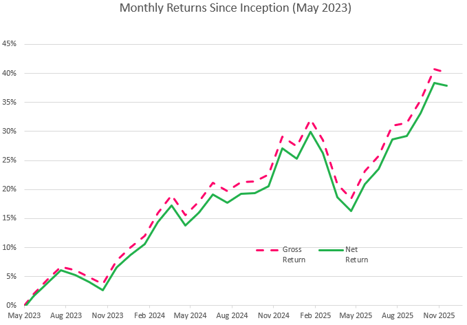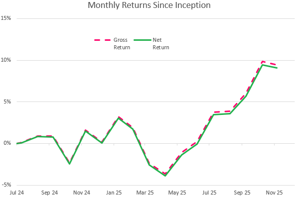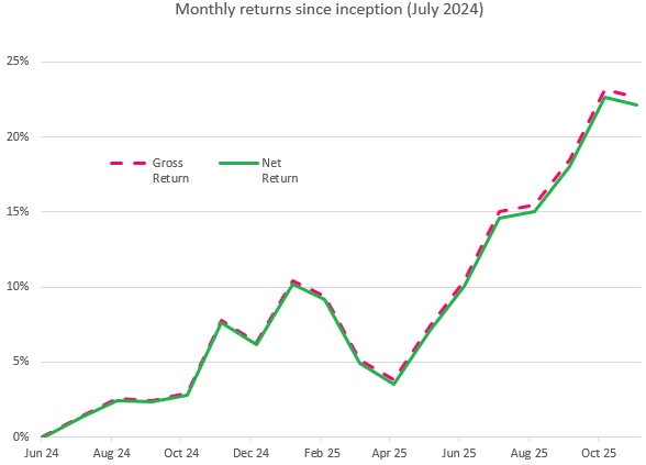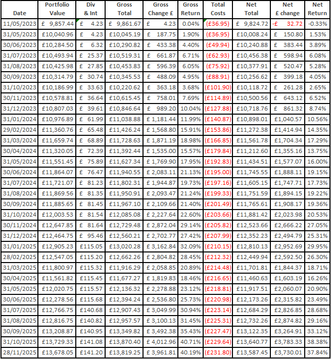 The return-to-date of 37.34% after fees / costs is too high for less than 18 months. The slight nudge down in November is, in my opinion, likely to be followed by more drops. That’s the nature of a higher risk portfolio; greater price volatility. I’m fine with that because I’m a long-term investor and don’t need to access the money for several years.